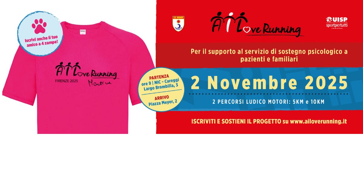 INFO ED ISCRIZIONI Domenica 2 Novembre 2025 – partenza ore 9 NIC AOUC Careggi; arrivo Casa AIL Piazza Meyer 2 Insieme per sostenere il servizio di supporto psicologico per i pazienti ed i familiari assistiti da AIL Firenze AILoveRunning è la passeggiata/corsa ludico motoria da 5 o 10 km organizzata dal Gruppo Sportivo Maiano affiliato […]